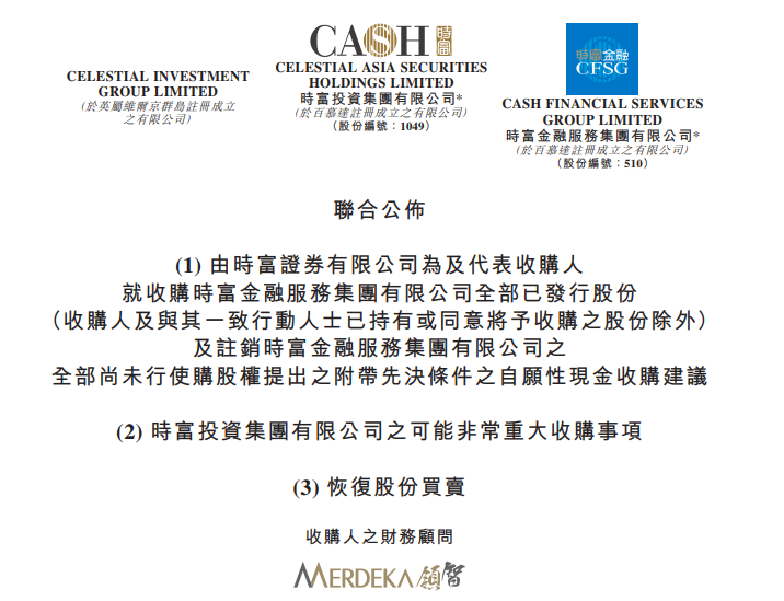 领智企业融资有幸担任时富投资集团(股份代号:1049)对时富金融服务集团 (股份代号:510) 提出自愿性现金收购建议之财务顾问