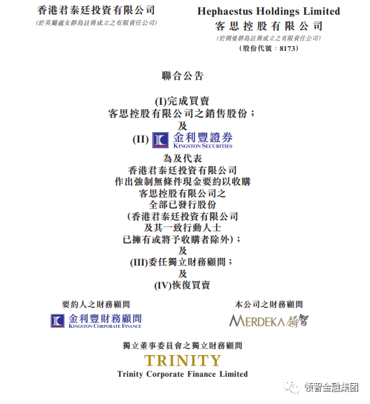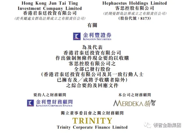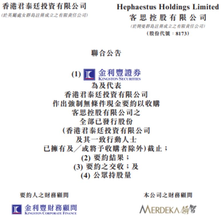 由领智企业融资担任财务顾问的香港GEM上市公司客思控股有限公司(8173)就其被作出强制无条件现金要约收购向股东寄发综合文件