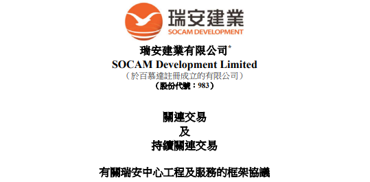 领智企业融资有幸担任香港主板上市公司:瑞安建业有限公司(股份代号:983)之关连交易及持续关连交易之独立财务顾问